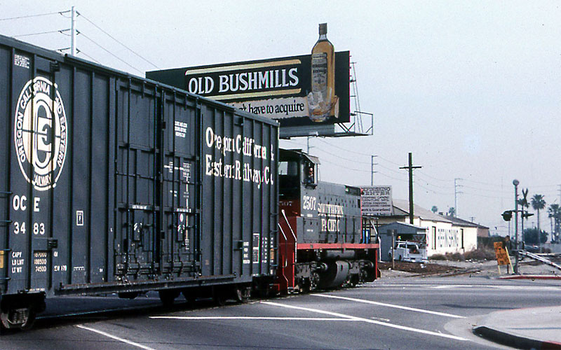 10/98 Looking west toward Ballona Creek and where Jefferson Blvd. crosses the track at the beginning of National Blvd. An eastbound Southern Pacific local freight train crosses the intersection of Venice and Robertson Boulevards in the 1980s. |