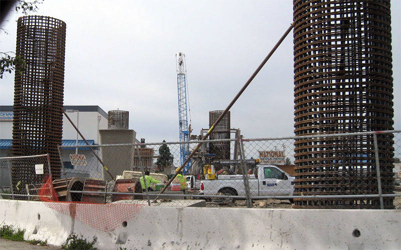 10/20/09 Two columns' rebar cages are in place east of the National crossing. The third column's footing is being bored at Wesley behind the white dump truck. The two cranes at far right are lifting its big rebar cage.