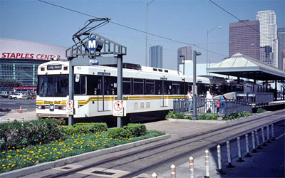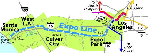 The Expo Line begins in downtown Los Angeles (sharing the existing Blue Line track), also serving Staples Center and the Convention Center and connecting to the rest of L.A.'s rail network. |