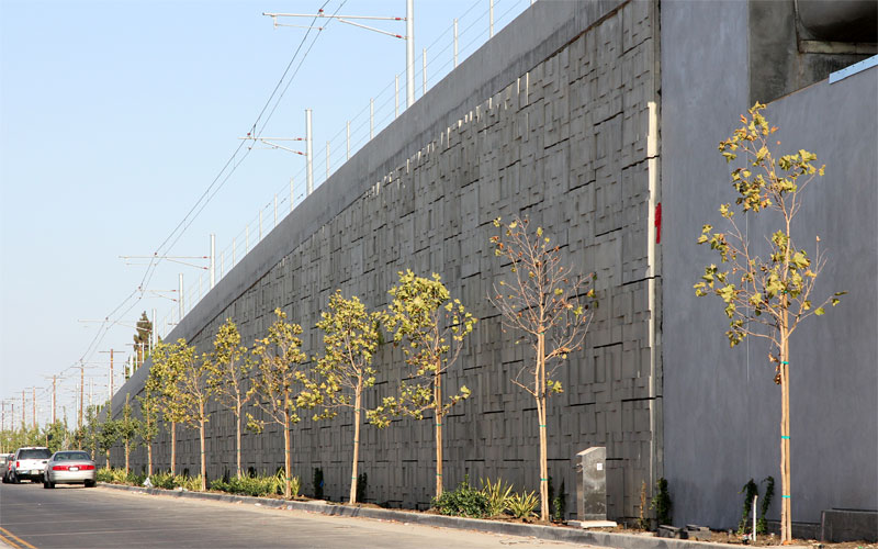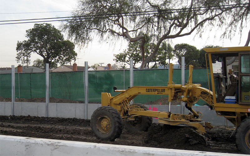1/29/10 The retaining walls and bridge are nearly complete. Construction is proceeding west of La Brea with soundwall poles and trackway grading, below at Cochran Ave.
