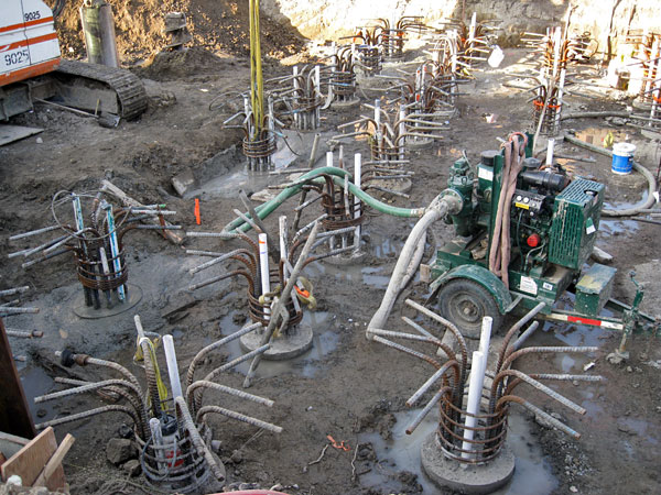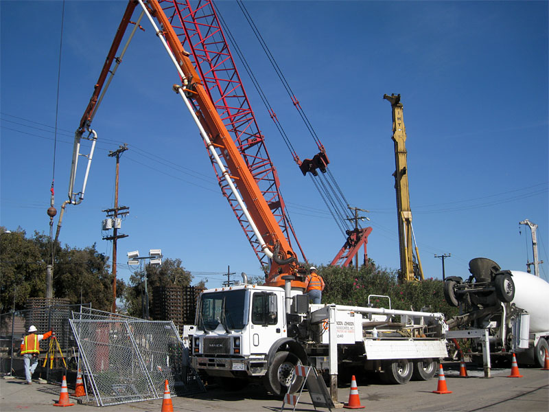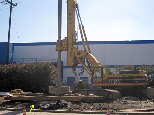 11/5/08 The hole is about 85 feet deep. The corrugated metal lining goes down the top 20 feet. The visible rebar cage is 40 feet long and overlaps the longer buried cage 20 feet. The hole is filled with a polymer liquid to keep the earth walls intact. Concrete is pumped down a pipe to the bottom. As it fills the hole the displaced polymer liquid is pumped out and filtered in the large tanks farther east on the right-of-way. In the photo above the concrete pumper's boom hose is inserted in the vertical pipe and the first of 30-40 concrete truck loads is being pumped into the hole.