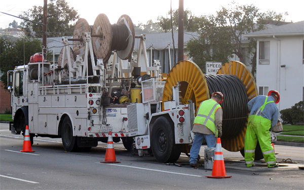 Delays on DWP undergrounding aerial power lines at La Brea and La Cienega were a major cause of the project being behind schedule. Above is a crew pulling new underground cables.