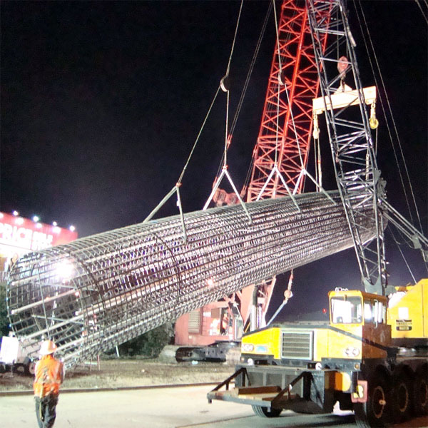 10/29/08 An 80-foot-long rebar cage is so heavy it took two cranes to lower it into the hole (Expo Authority copyrighted photo).