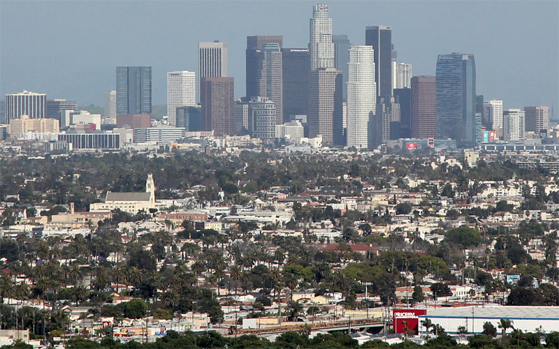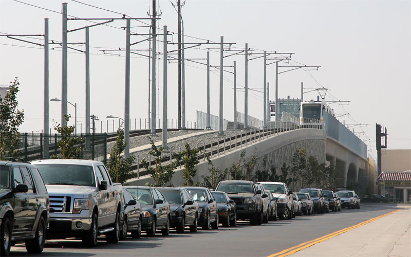 3/10/10 The Expo Line crosses the La Brea bridge (bottom) on its way to downtown Los Angeles in this view from Baldwin Hills Scenic Overlook state park.