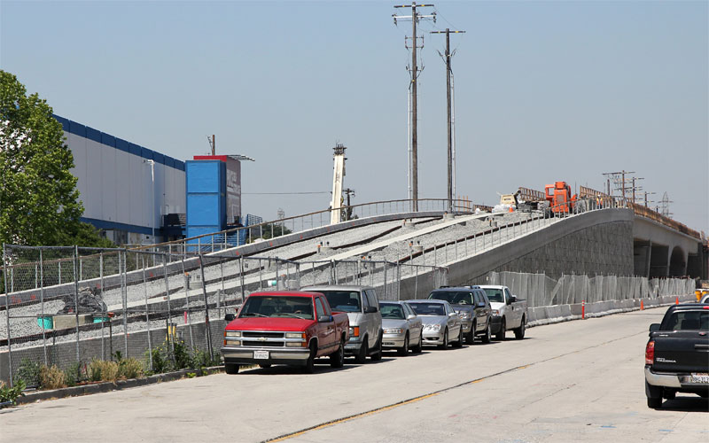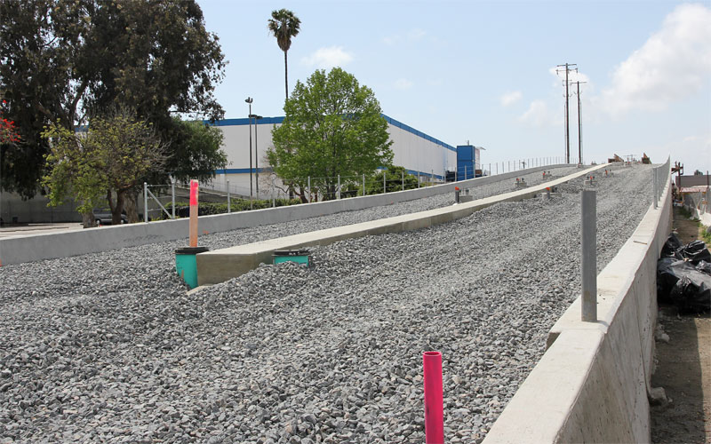 4/12/10 The falsework over La Brea has been removed compare with the simulation below. Ballast is on the east ramp (below), awaiting the first ties and rails west of Farmdale Ave.