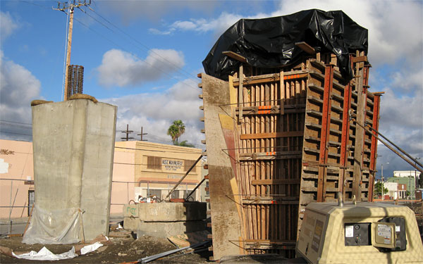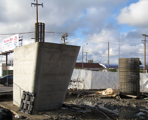 1/24/09 Above are the first two columns just east of La Brea, looking west. On the left is the first completed column; on the right is the footing's rebar cage extending above ground. Also note the high wires on the west side of La Brea across the right-of-way are finally down. Construction on the west side of La Brea will commence after all the wires are moved. Below the two columns farther east of La Brea have been cast, with forms still on the right one (looking east).