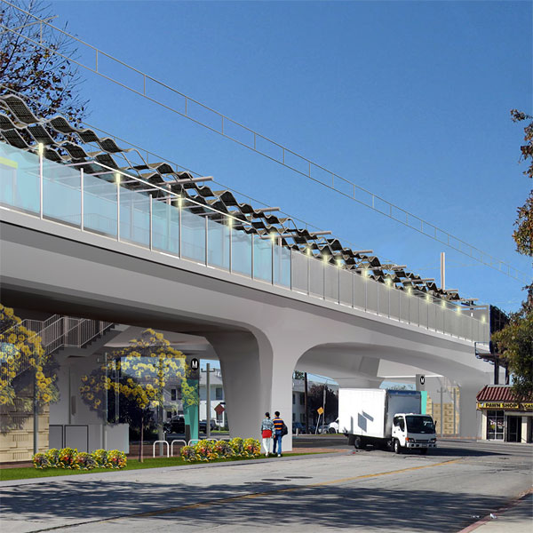 10/10/08 Bridge construction has begun at La Brea and La Cienega by drilling huge holes in the ground for column footings, filling them with steel rebar cages and concrete, and casting columns above ground. This photo above shows a hole-boring crane east of La Brea. The yellow arrow points to a corrugated steel cylinder just showing above ground, lining one of the eastern pair of column footings, covered with wooden planks. Above is an Expo Authority image of the La Brea bridge with aerial station, looking north. Below is another, looking southwest. |