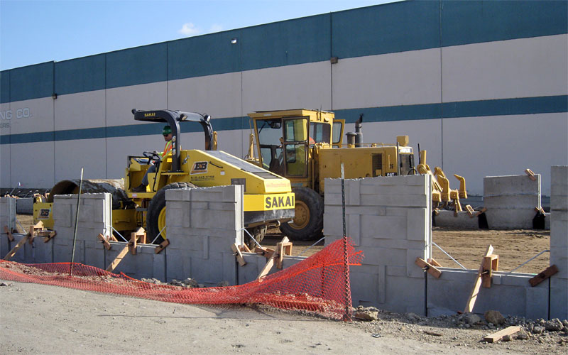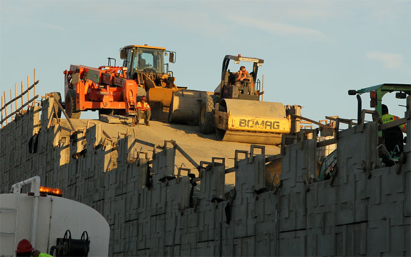 10/5/09 MSE (Mechanically Stabilized Earth) walls are beginning east of the La Cienega bridge. Earth is being graded and rolled between precast concrete panels.