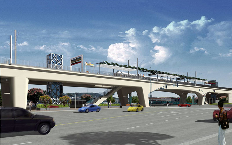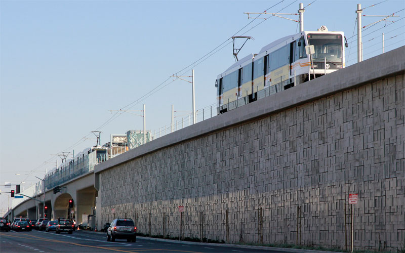 This Expo Authority image looking south at the La Cienega bridge and station shows the arched span and sloped columns reflecting the Urban Design Committee's requests. |