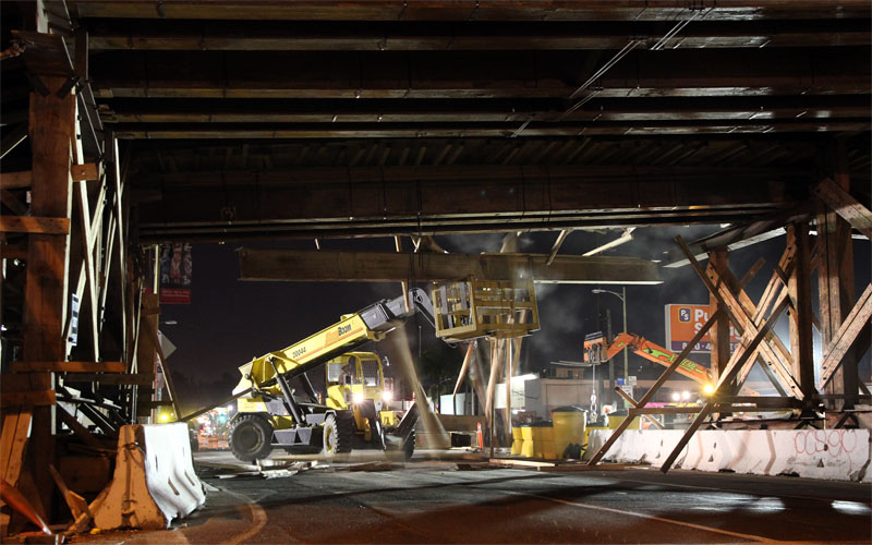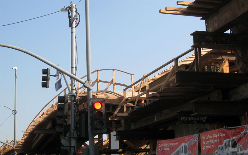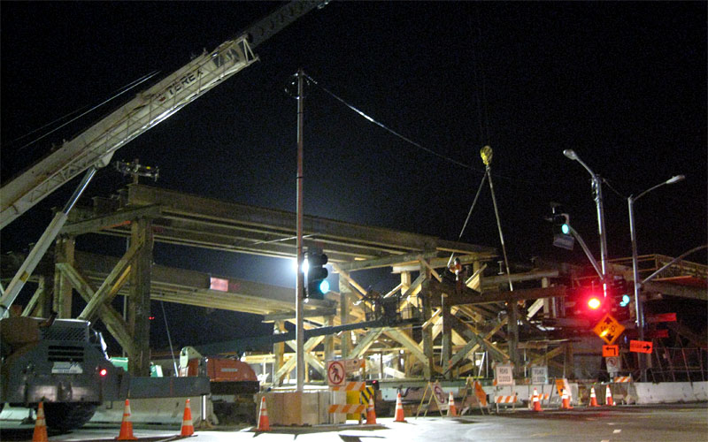 4/1/10 Another milestone: La Cienega Blvd. was closed tonight to remove the bridge falsework! A shower of wood is falling as a steel beam is pulled away. Below is a last view of the falsework with the full-height MSE wall to the right along Jefferson Blvd.