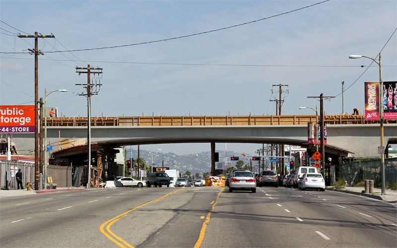 4/2/10 It's finally visible! Here are two views of the La Cienega bridge with the falsework down (except for the higher station platform between spans).