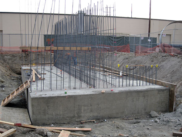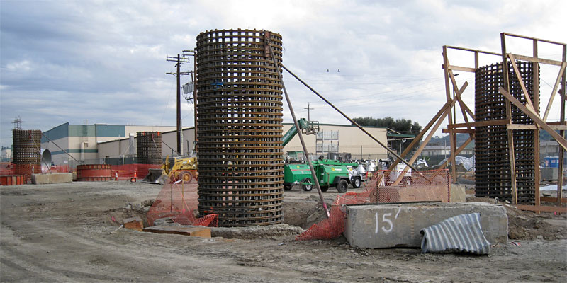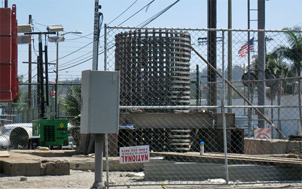 6/1/09 At La Cienega there are still four footings and columns that cannot be built until the power lines are underground. These four big steel cylinders will line the upper part of two footings on each side of La Cienega.