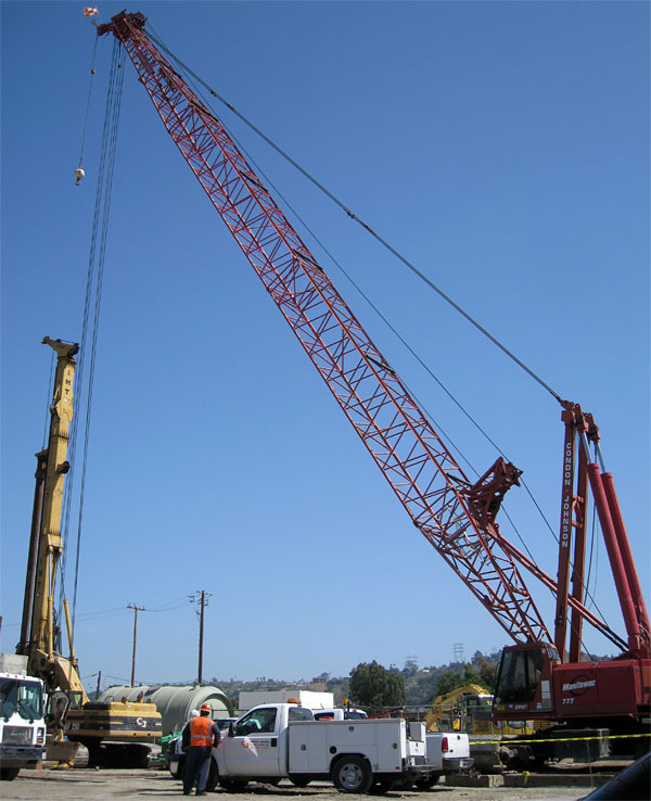 7/23/09 Above are the crane (right) and drill (left) used for the remaining footings on the east side of La Cienega, seen below behind the crane, one with its rebar cage installed and just filled with concrete.