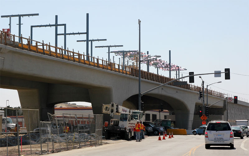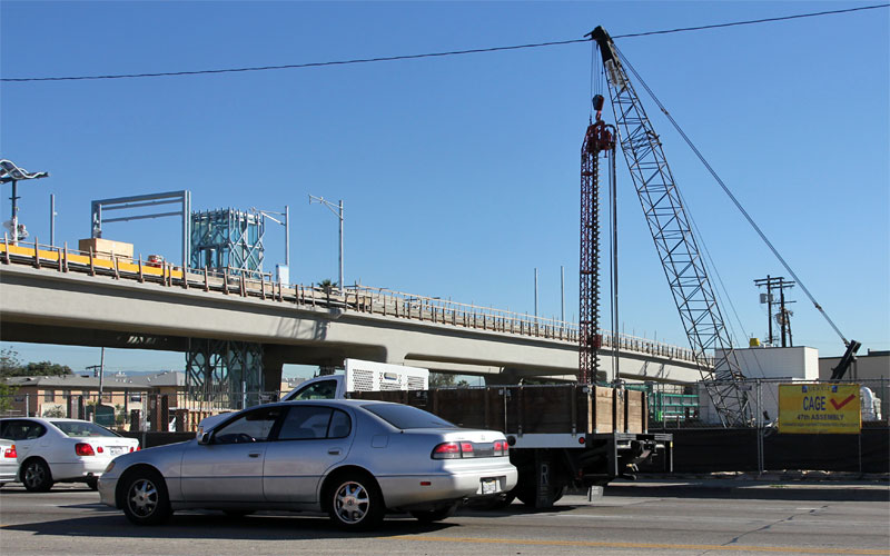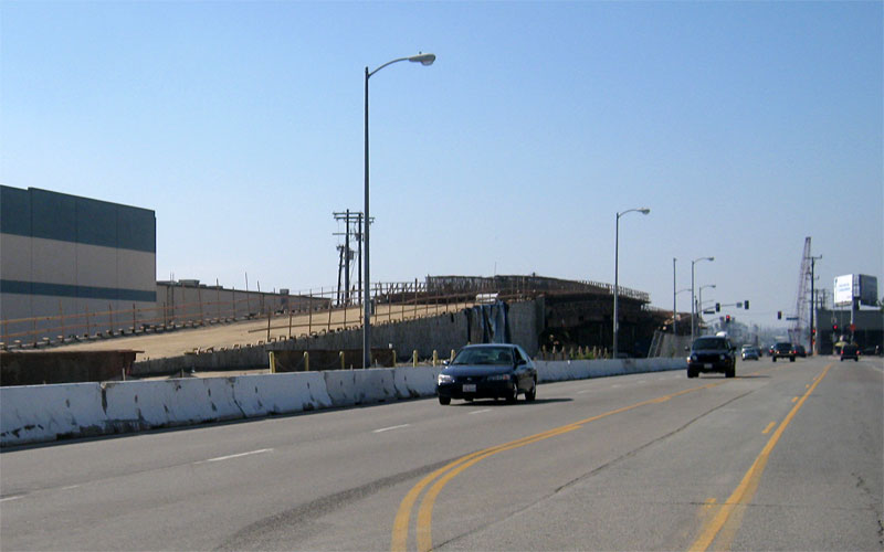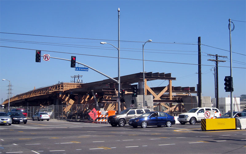 2/23/10 Looking west along Jefferson west from La Cienega we see the nearly-completed La Cienega bridge and aerial station on the left, falsework for the Jefferson-Ballona Creek bridge in the distance on the right, and the MSE (Mechanically-Stabilized Earth) fill section rising in between.