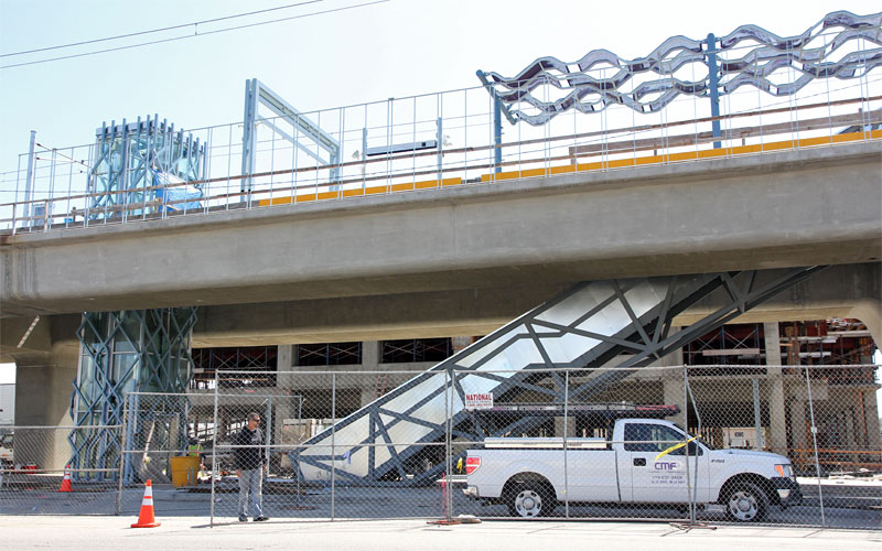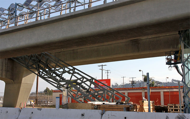 3/25/11 — This shows bridge side frames, elevator glass, canopy, and parking structure progress at La Cienega. Sheet metal has been newly installed on the east stairway.