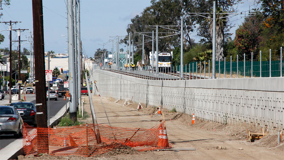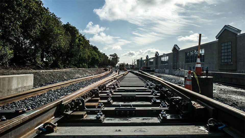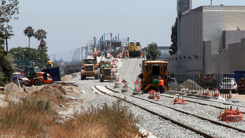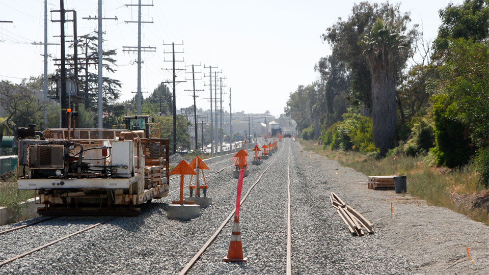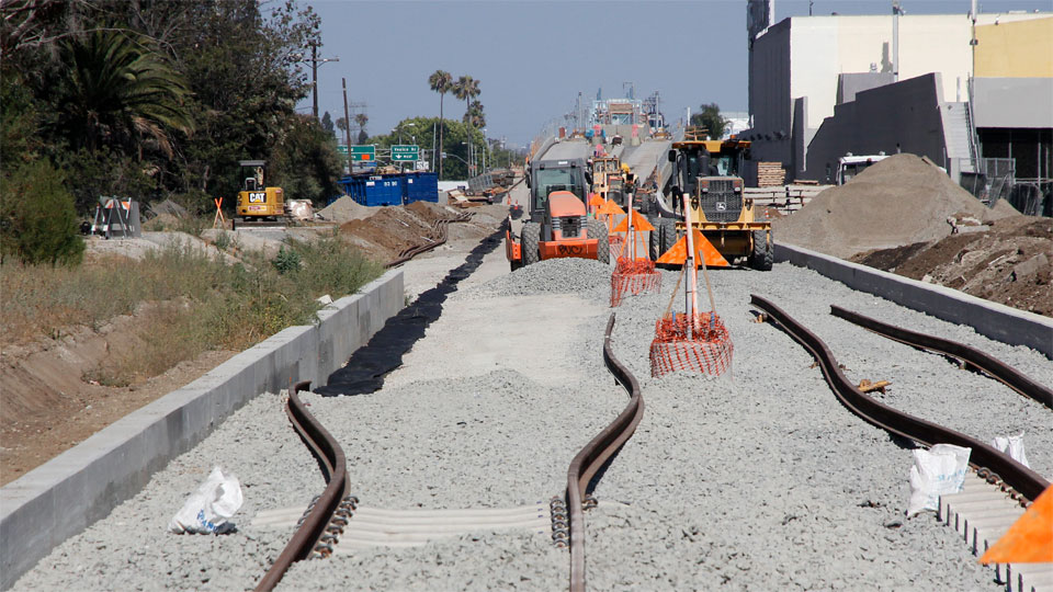 2/28/14 — Tracks have been laid between the self-storage building and the freeway in Palms (Expo Authority photo).