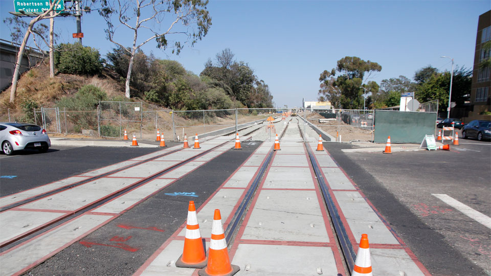 6/15/14 — Looking east toward the Culver City station (above and zoomed below) and west toward Palms (bottom) from the new crossing at Bagley Avenue shows the tracks nearing completion, all the way from Military Avenue.