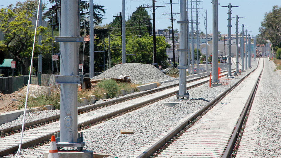 7/23/14 — Looking east from Bagley, the eastbound track goes up the ramp to the Venice Blvd. bridge (above) but rails are still being installed on the bridge itself (below). OCS poles with crossarms and LED lights are in place west of Bagley (bottom).