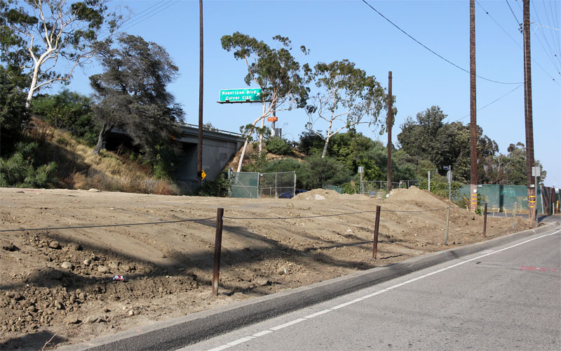 7/27/11 — The right-of-way north of Exposition Boulevard, looking east toward Bagley Avenue, where dirt had been piled for the Phase 1 construction 5/9/11 — Tonight's Expo Authority - Skanska/Rados Phase 2 community meeting featured a poster of this "site concept" image of the Palms station.