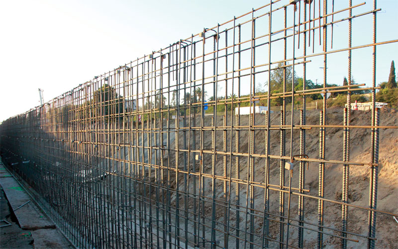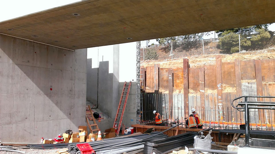 A view from National Blvd. (above), and a detail of the pipes to contain tensioning cables (below).