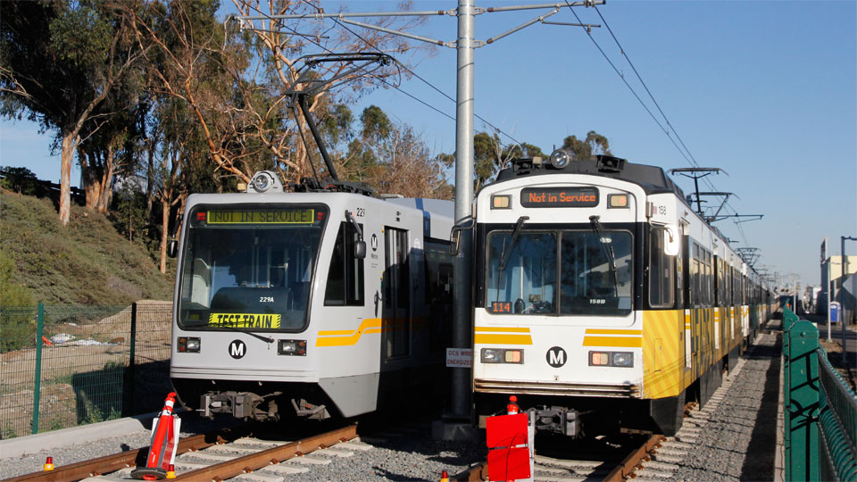5/21/16 — Opening Saturday, a train pulls into Culver City station (above), and heads west in front of the downtown L.A. skyline and into Palms.