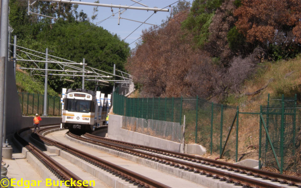 4/6/15 — Today was the first day of Expo Line phase 2 clearance testing and the first train to operate on phase 2! This LRV was towed to Bagley last night, ran on its own under OCS power up onto the bridge, and now begins its trip west toward the Westwood station, about 10:30 this morning.