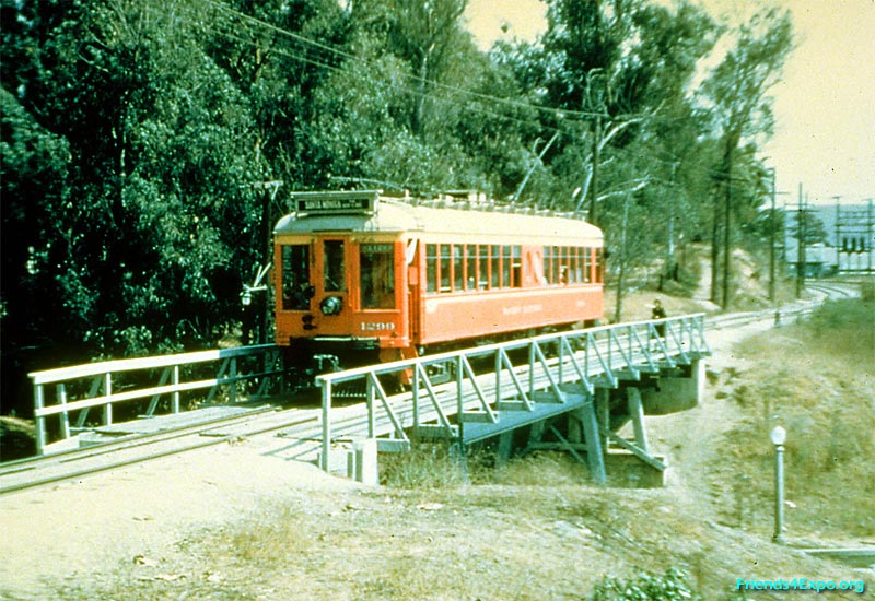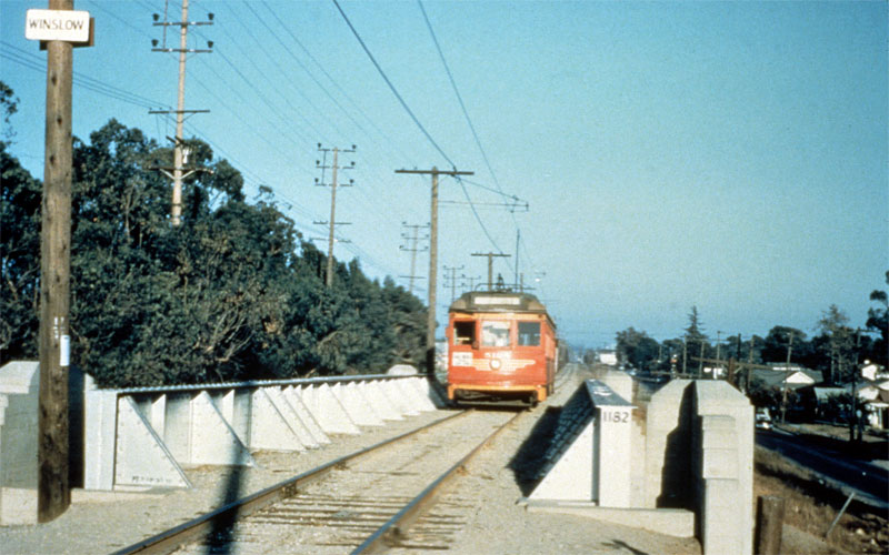 c. 1953 — A PE Air Line car crosses National Boulevard (above) and Motor Avenue (below), looking east, before the freeway came through (photos by Ralph Melching and Alan Weeks).