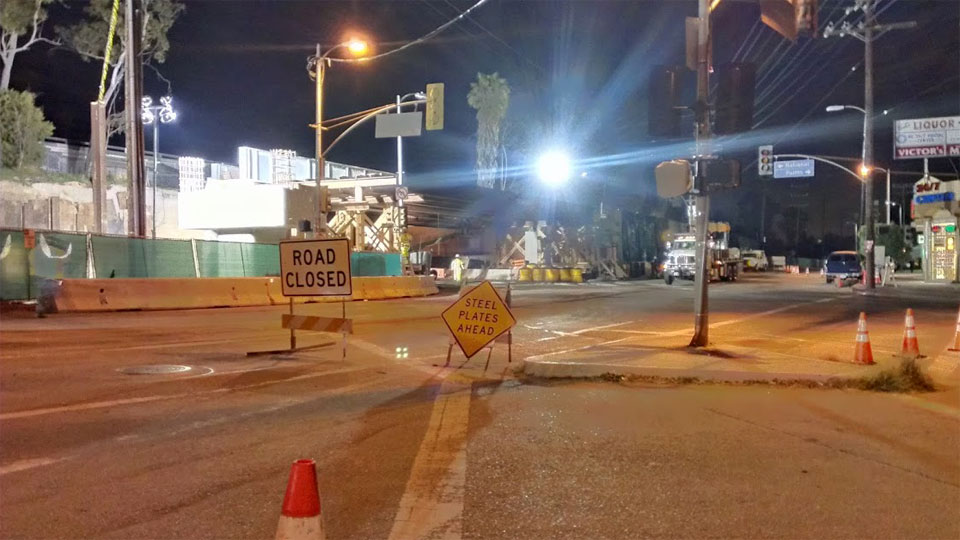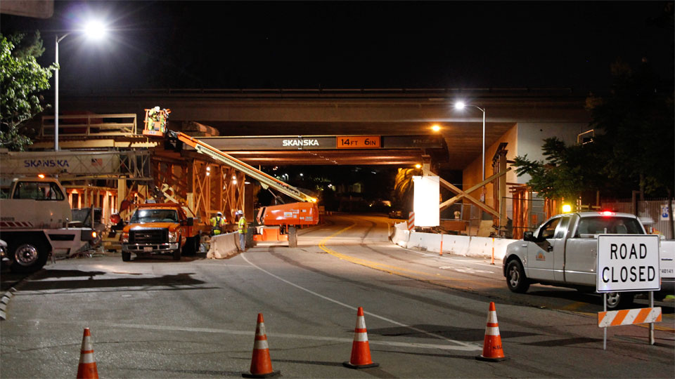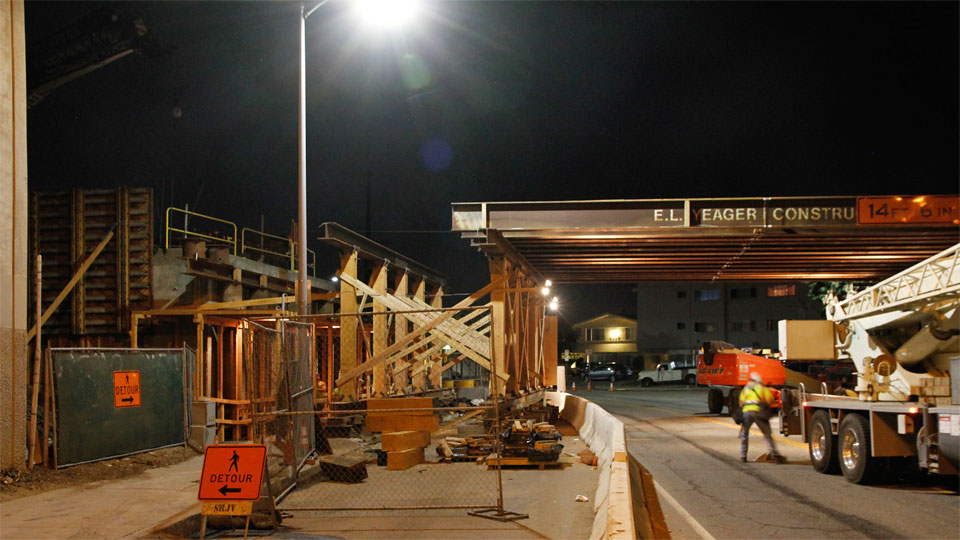 2/12/13 — The steel falsework went up quickly at night over National Blvd (rajacobs photo, below). Note the completed T-shaped concrete bridge column left of the Road Closed sign above, which was just a rebar cage below on 12/10/12.