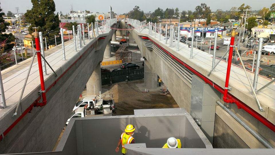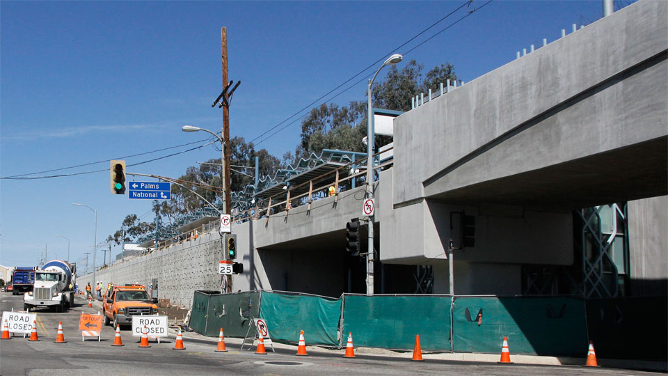 5/17/14 — Tracks and soundwalls are being installed along National Blvd., and the elevator cages are in at the Palms station (bottom).