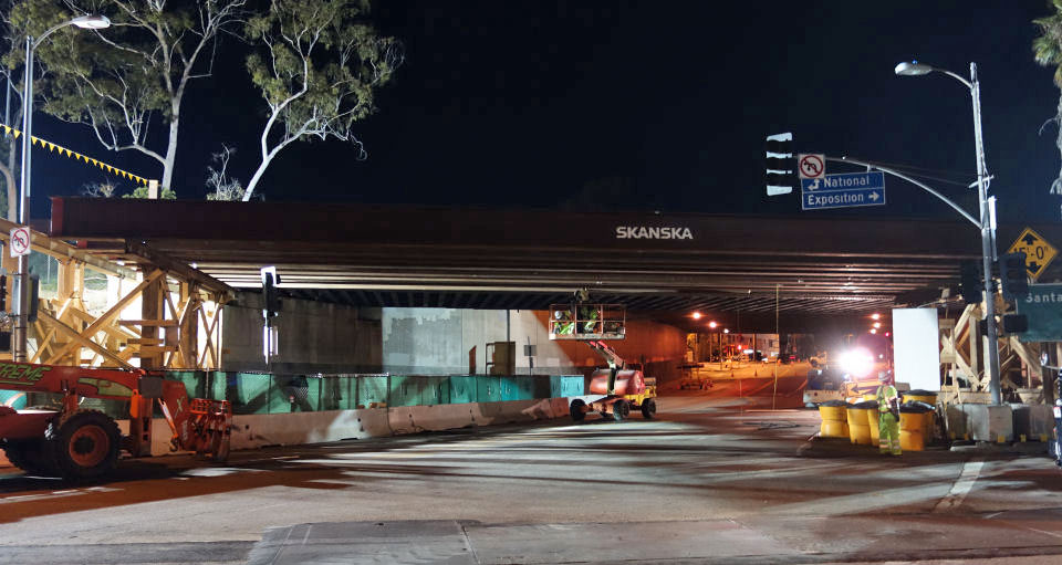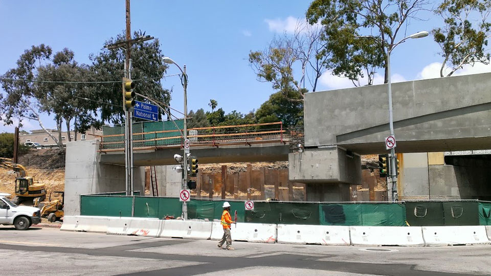 National / Palms. A new concrete through-girder bridge will be next to the existing steel plate girder bridge. The bridge over Motor Avenue will be replaced with a new concrete bridge. They also had rolled out plan and profile drawings; note the vertical scale is exaggerated.