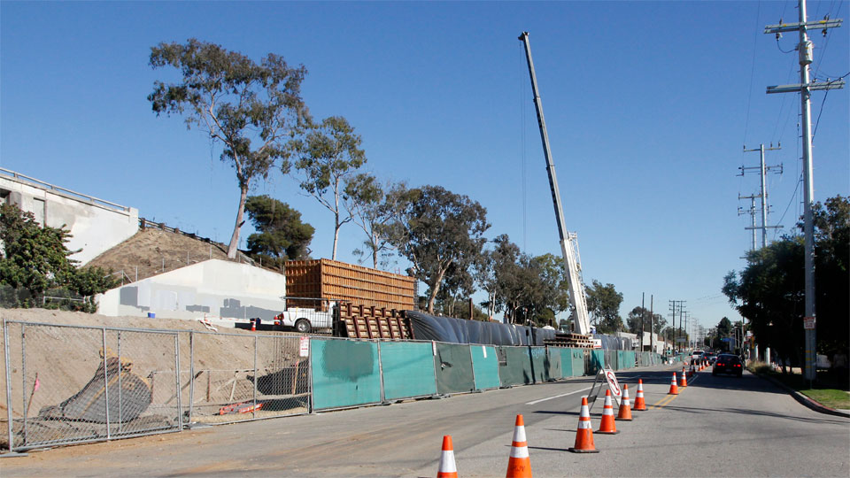 6/24/13 — The existing Motor Avenue bridge abutments are being extended north (toward the freeway) to support the new double-track bridge.