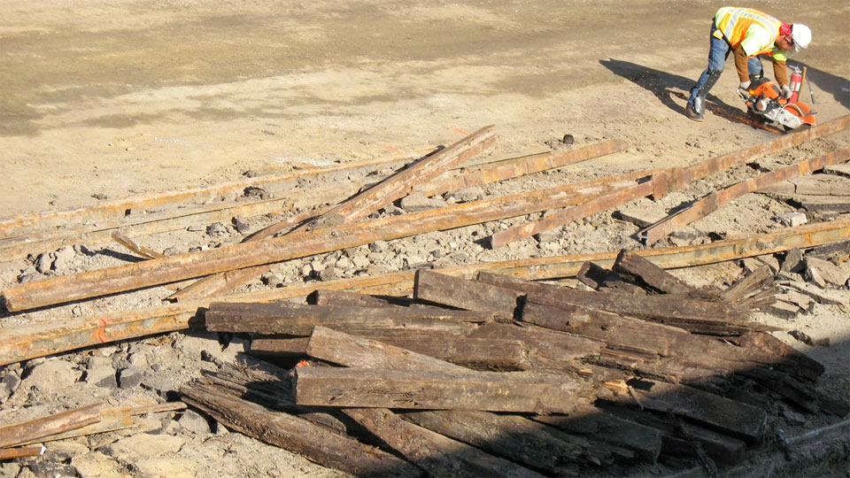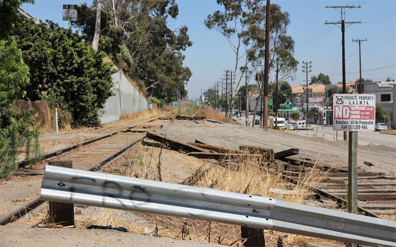 12/9/13 — With the falsework gone you can see Venice Blvd. between the new bridge spans (above). Old rails and ties are stacked on the right-of-way west of Venice (below).