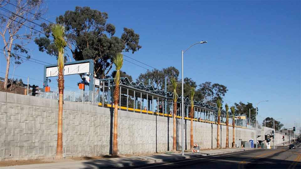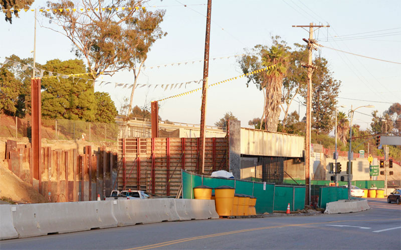 12/26/13 — Motor Avenue's I-10 underpass frames the new Expo bridge in light (above), and the Palms station and retaining wall is coming along (below).