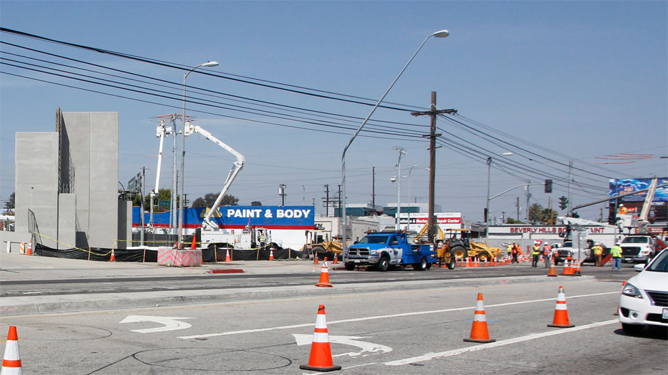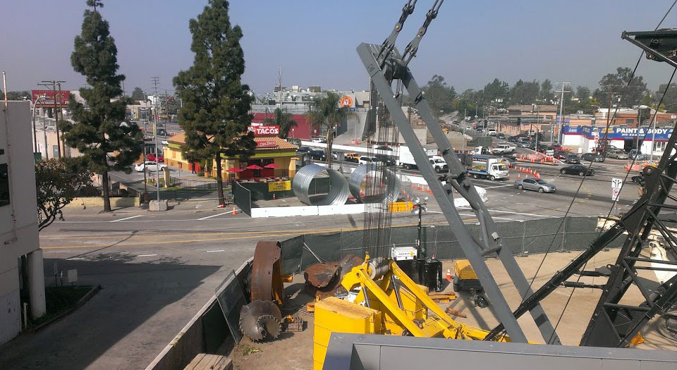 3/29/13 — Drilling of the column footings across Venice Blvd. is about to begin. Note the drill parts left of the yellow crane, the steel cylinders to line the first hole at the corner of Venice and Robertson, and the abutment on the far side of Venice.