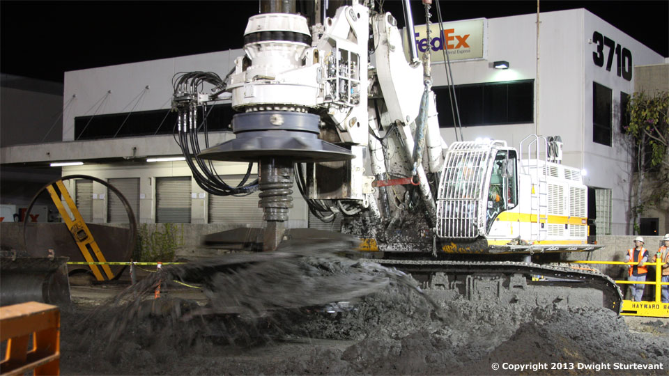 4/1/13 — Night drilling has begun with mud flying (above), with the 12-foot-diameter, 100-foot-deep hole for bent (column) 16L completed (map below).