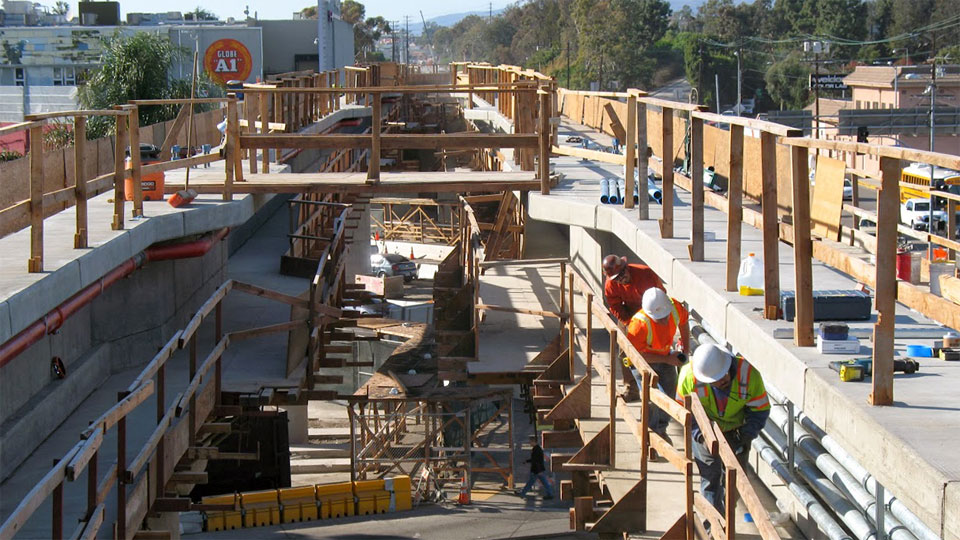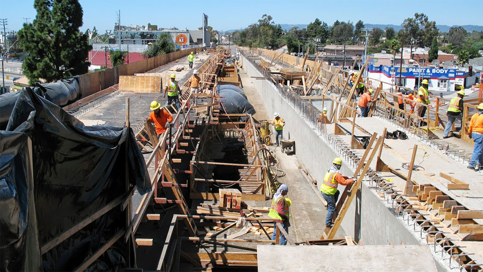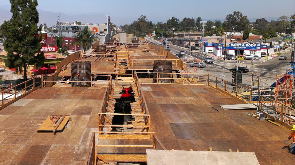 8/21/13 — "Stems and soffits" (sides and bottom) of the Venice Blvd. bridges are complete and forms are being stripped on the left.