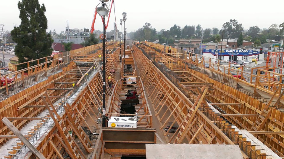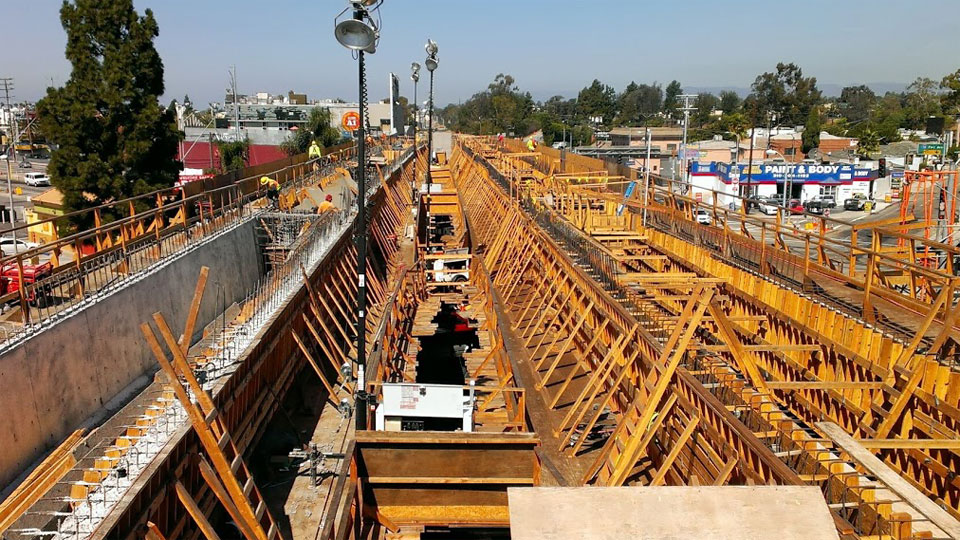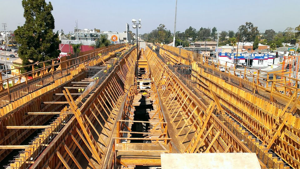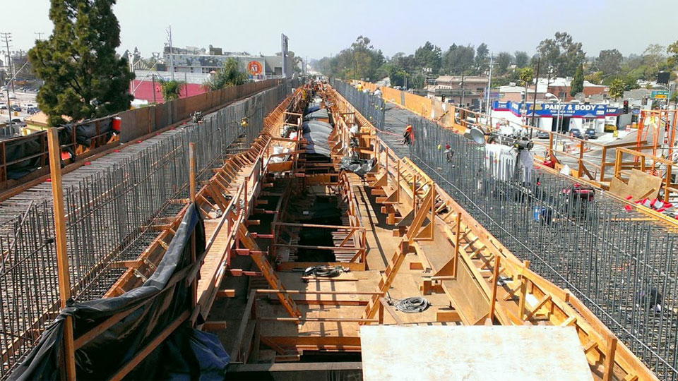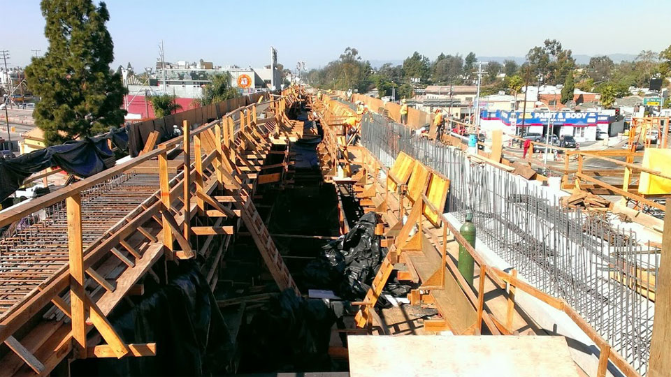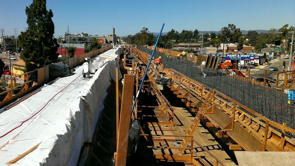 7/17/13 — Forms and rebar are well underway for the single-track box beams across Venice and Robertson Boulevards.