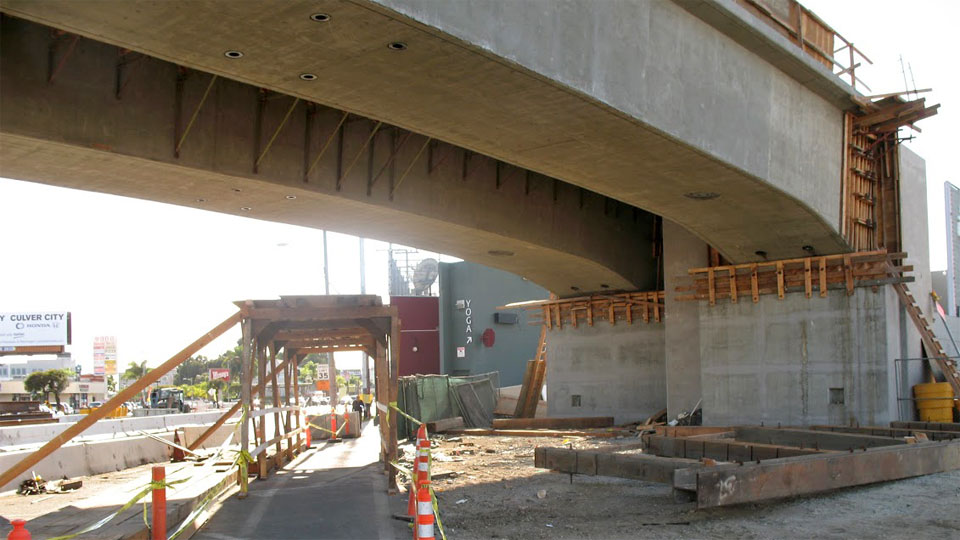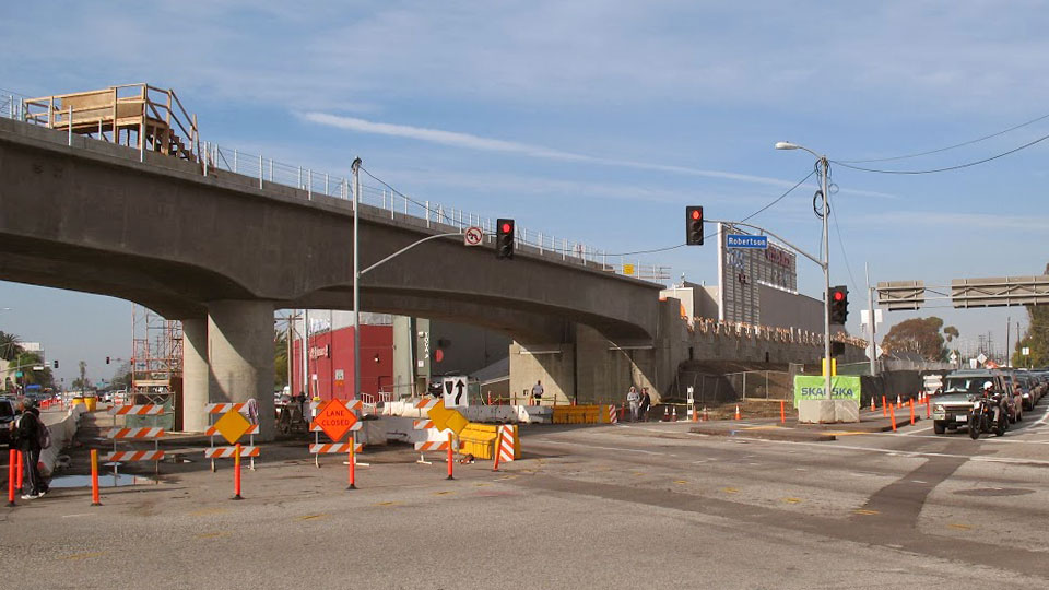 The new bridge abutment on the west side of Venice Blvd. is complete, power line relocation is nearly done, and column footings (in the Venice median and at the corner of Robertson) will be next.