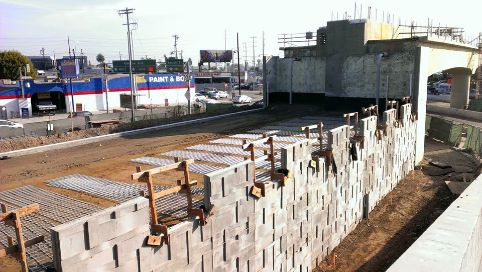 2/10/14 — MSE walls are rising for the ramp on the west side of the Venice Blvd. bridge, showing the steel grids used to tie the wall panels into the compacted earth fill.