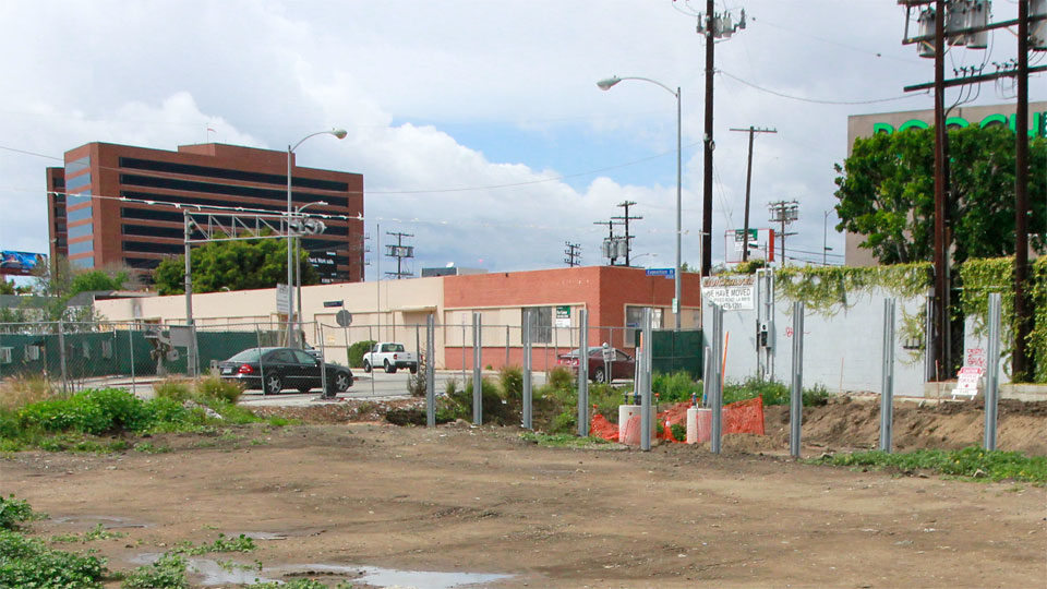 11/4/11 — Northwest corner of Exposition Boulevard and Barrington Avenue, the metal gate right-of-center is over the former track.