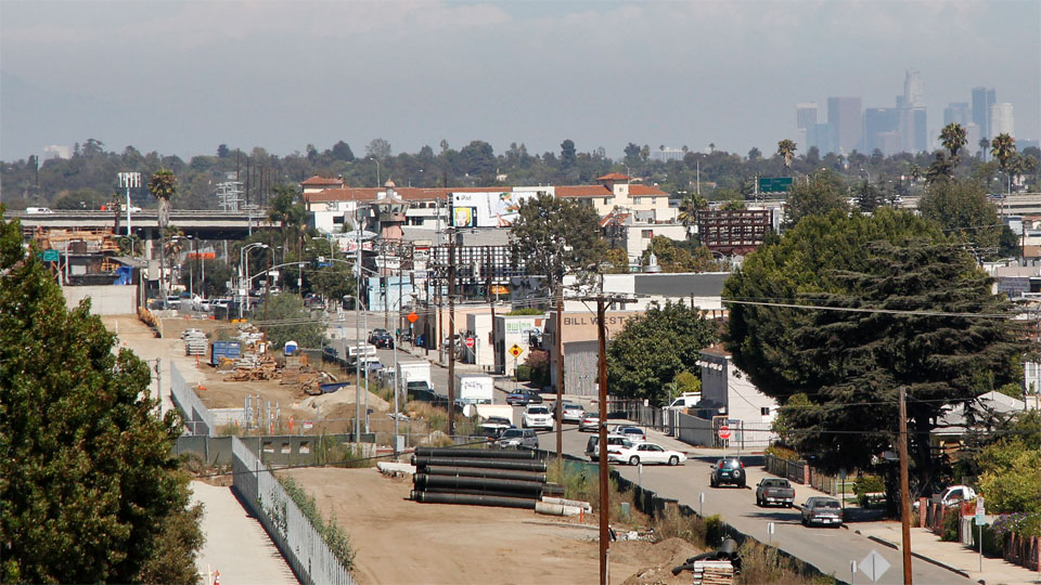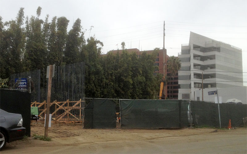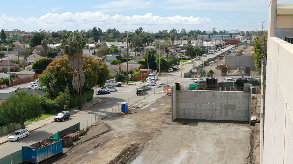 10/10/12 — Looking west from Military Avenue, concrete was being pumped east of Sepulveda. Also note the temporary parking lot on the Expo right-of-way.