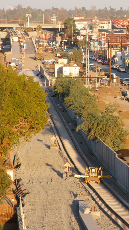 6/1/16 — The familiar aerial view east toward Barrington and the 405 (above) and west to the Bundy station and Santa Monica (below), now with trains carrying passengers!