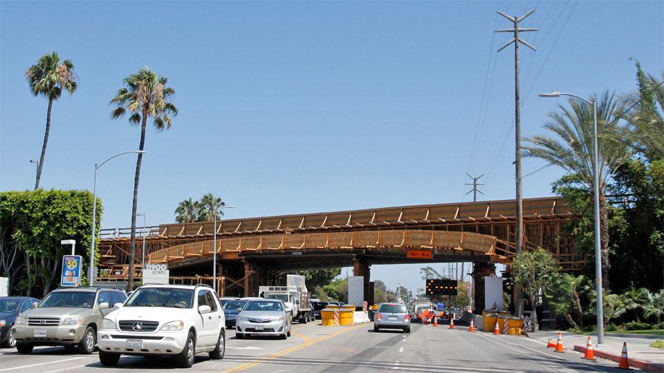 A concrete through-girder bridge is thinner above Sawtelle Boulevard, west of I-405.