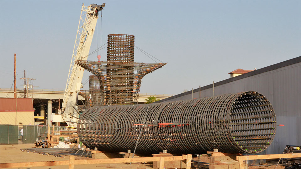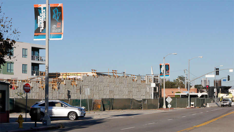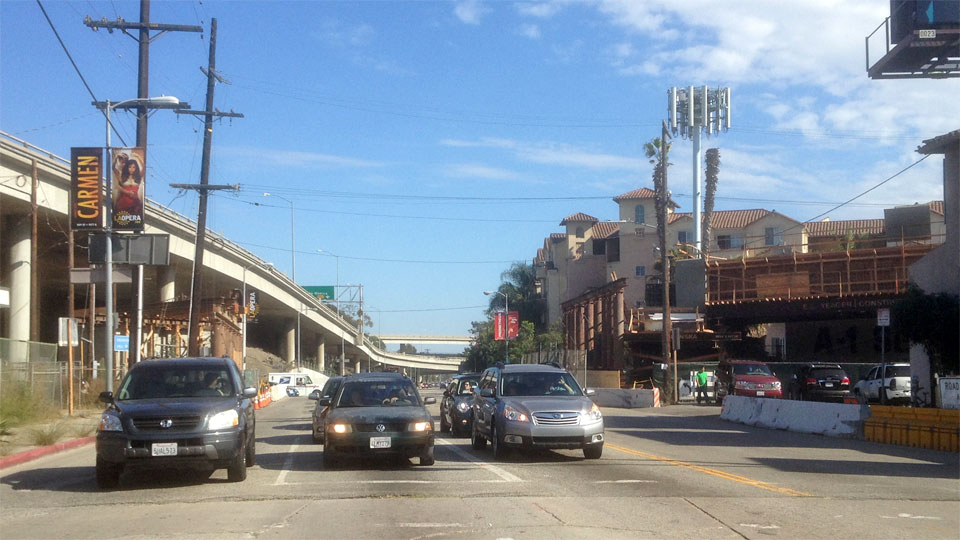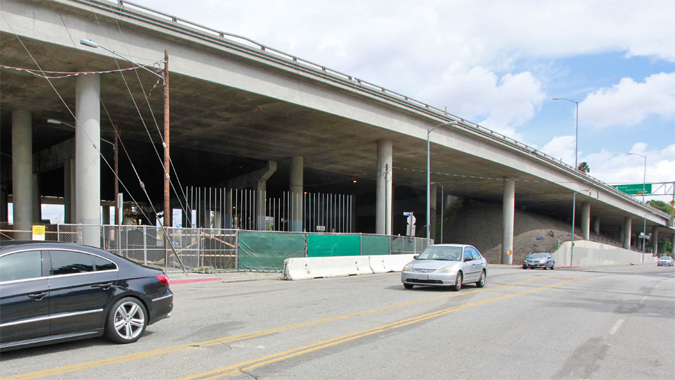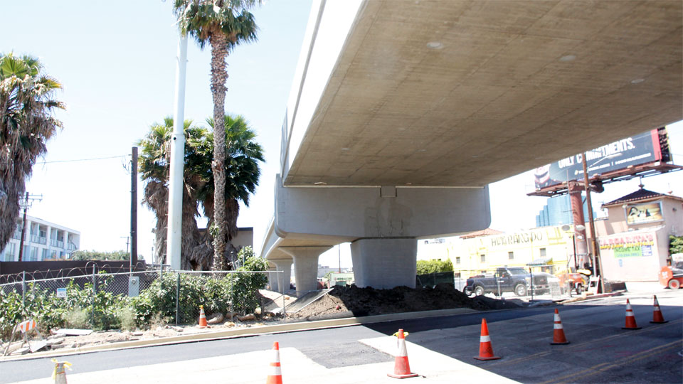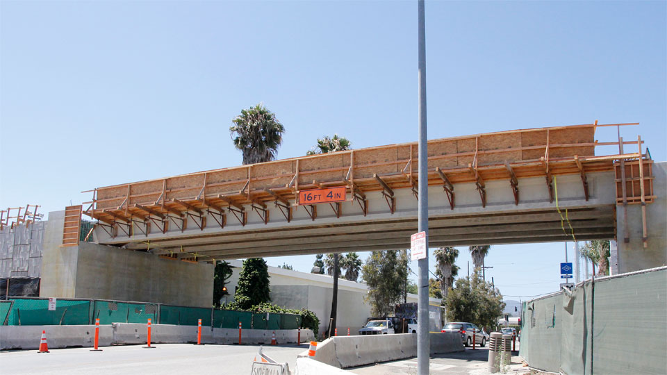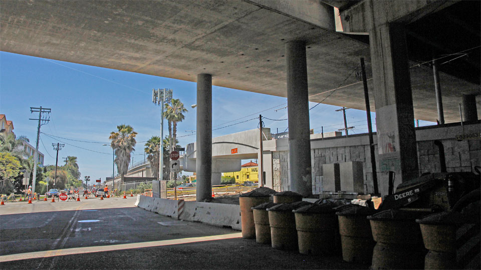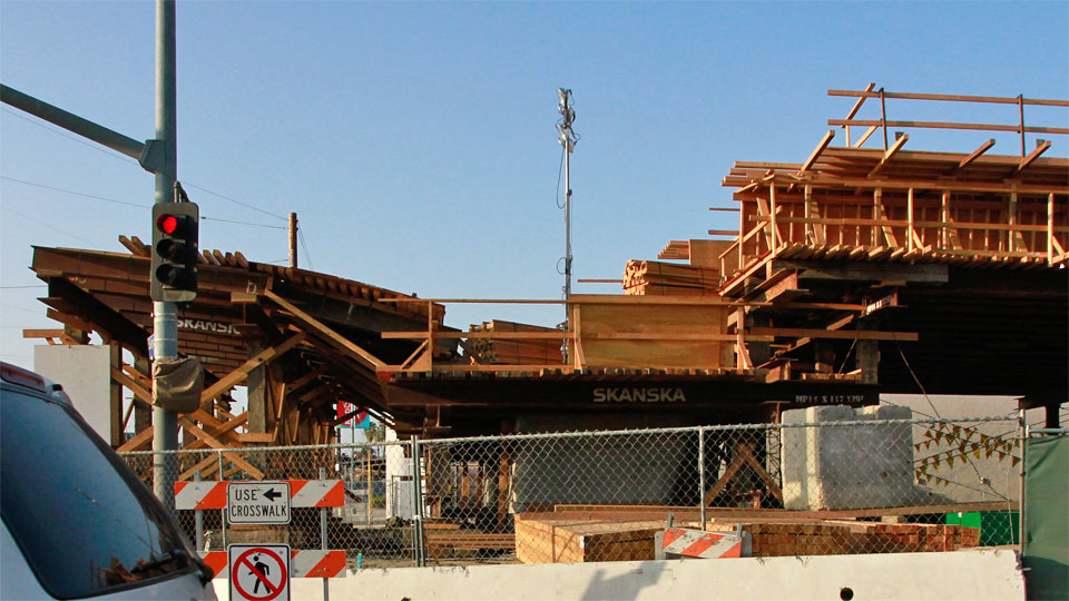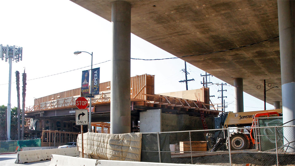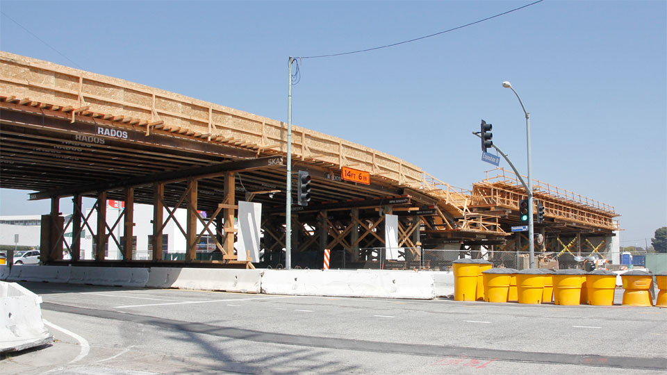 6/10/14 — Falsework is down from the Pico bridge, showing the dual straddle bents used to cross the boulevard at this slight angle.
