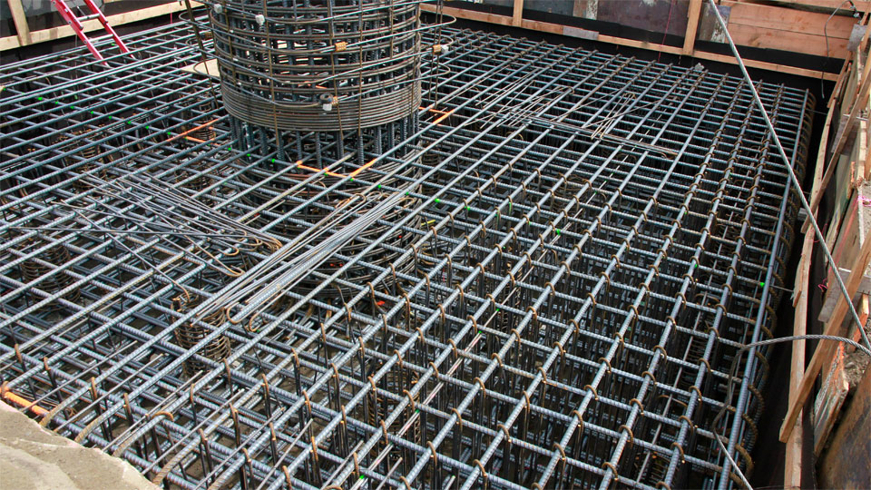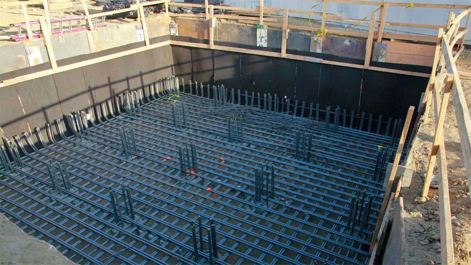 3/4/13 — Columns between Sawtelle and Pico are well along. Above is a detail of the rebar-filled slab over the 5 x 5 CIDH piles before the column rebar cage is added.