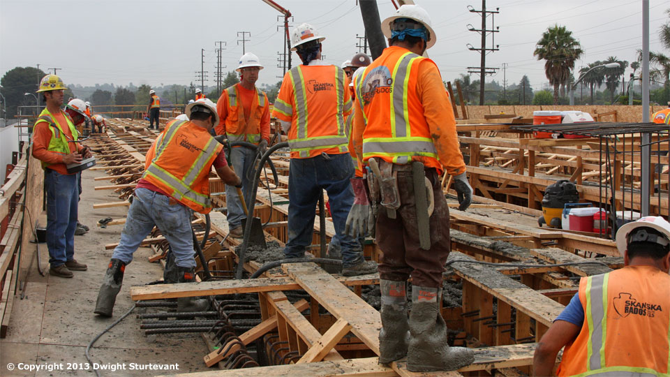 6/18/13 — A big concrete pour is underway for the Sepulveda bridge's stems (vertical walls) and soffits.