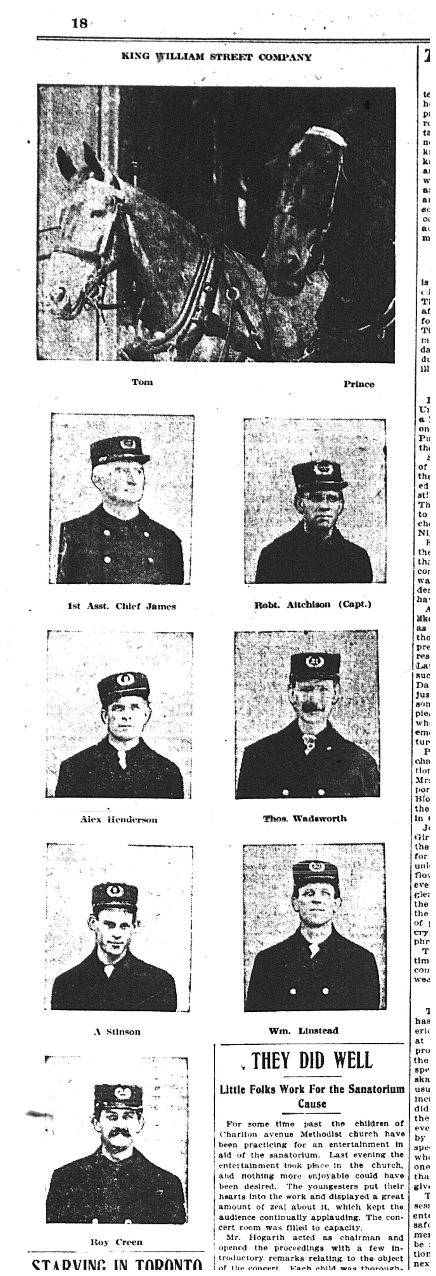 A few weeks before the fire a photographer for the Hamilton Spectator visited the King William Street Company and photographed several of the members. Captain Robert Aitchison's picture is 2nd row on the right, Alex Henderson is 3rd row on the left, and Roy Creen is at the bottom (William Seal's photo was either not taken or not published). Photo from the Archives of Ontario, L 23 Newspapers, N 184 reel 162, Hamilton Spectator, December 7 1907, pg 18.