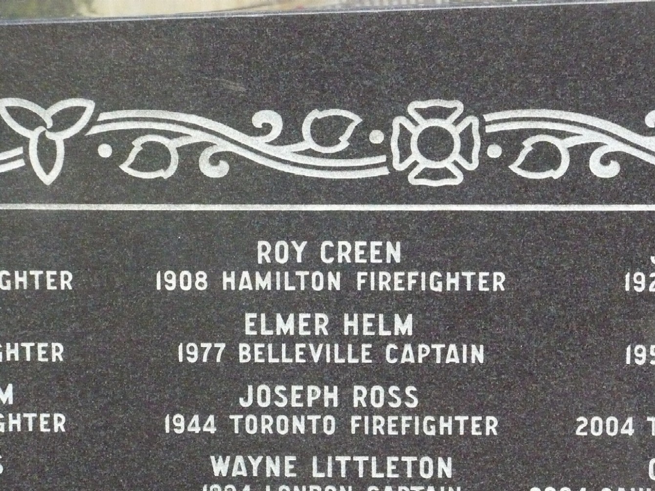Roy Creen was the eighth firefighter killed in the line of duty in the history of the City of Hamilton. He was buried in Millgrove cemetery on Thursday Jan 23, 1908. His name is inscribed on the Ontario Firefighter’s Memorial located at Queen’s Park in Toronto, just northeast of the intersection of College & University Avenue. Roy Creen’s name is on the west side of the north stone, at the top of the third column of names.