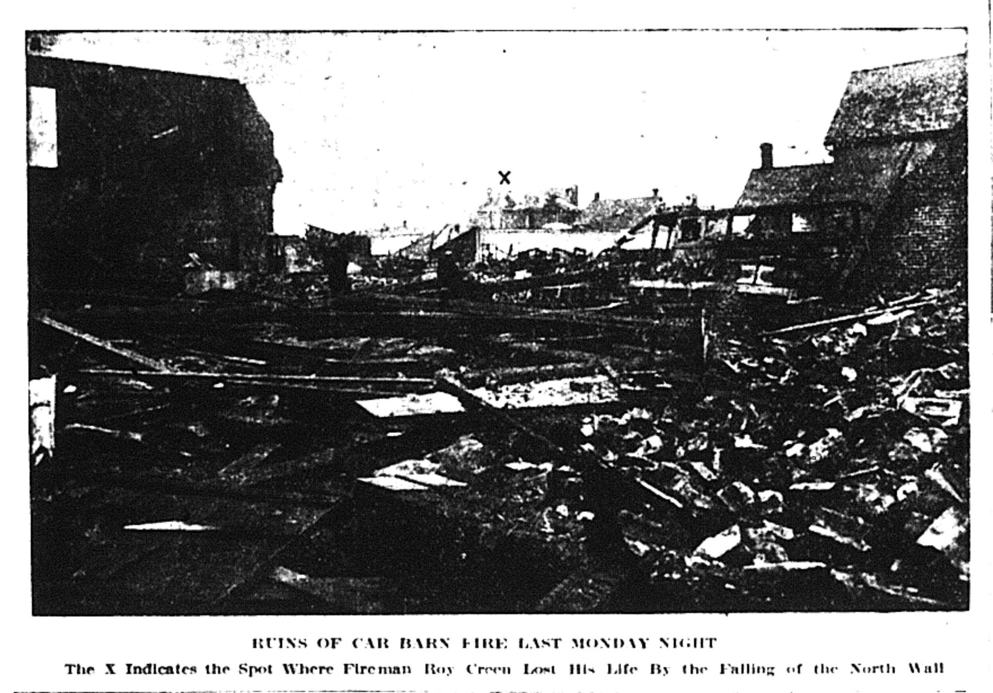Four men were spraying water on the north wall of the car barn: Captain Robert Aitchison, and Firemen Roy Creen, Alex Henderson and William Seal. Without warning the north wall of the car barn began to buckle outward. The four men dropped their gear and ran. Aitchison and Henderson ran northwards and cleared the collapsing wall. Seal also ran northwards, but was pinned by falling debris. Fortunately he was dug out with no injuries. Not so fortunate was Fireman Creen, who had run more east than north and had stumbled into the small ditch. The collapsing wall knocked down the north-side shed, and a large mass of brick and roof timbers landed on Creen, killing him instantly. Firemen and spectators quickly began digging through the rubble, and Creen’s body was found around 9 pm.