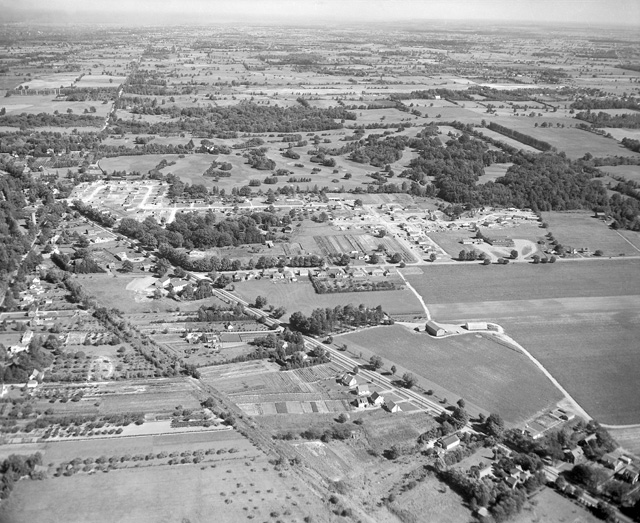This aerial photo of the then new suburbs of Ancaster taken in 1952 shows the path of the B&H, from the bottom of the photo to the center-left. Wilson St is the road running from the lower-right corner of the photo to the centre-left, with Fiddler's Green Rd running horizontally through the middle of the photo and Golf Links Rd running off into the distance at the top of the photo. (Photo courtesy of the Hamilton Public Library, Local History & Archives)
